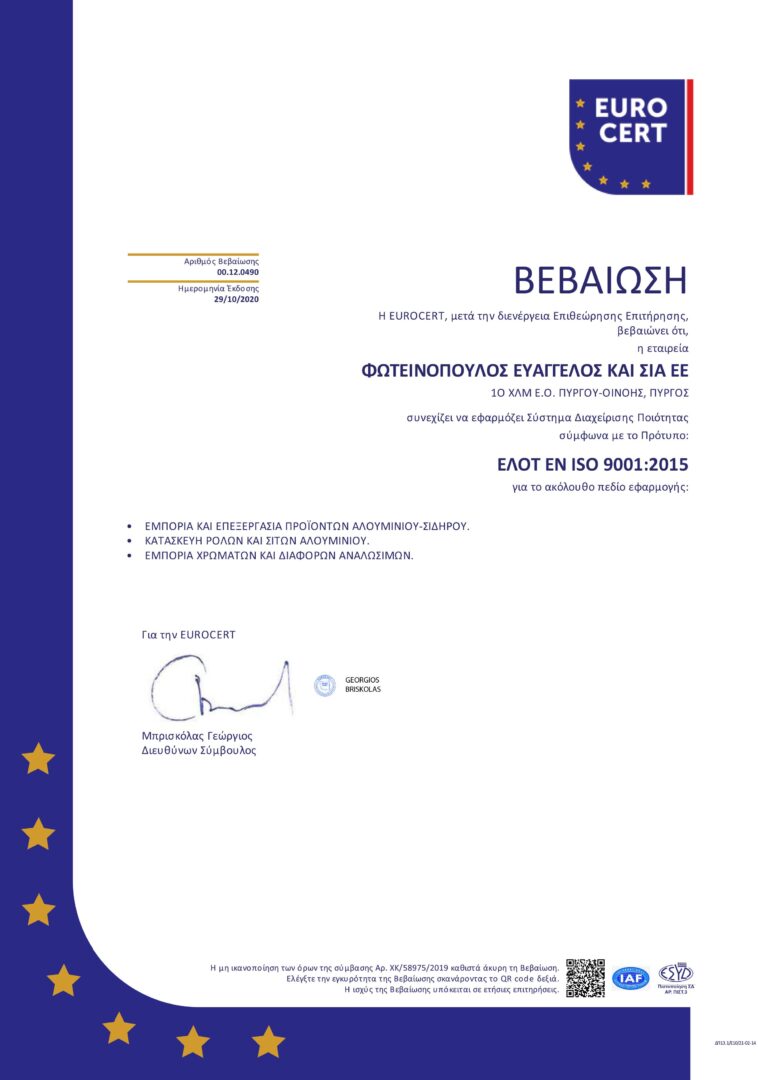 Με μεγάλη μας χαρά , σας ενημερώνουμε πως η εταιρεία μας πιστοποιήθηκε από τον οργανισμό EUROCERT με το σύστημα ISO 9001:2015 (κατείχαμε και το προηγούμενο ISO 9001: 2008), το οποίο αφορά στην διαχείριση της ποιότητας για τις κατηγορίες: