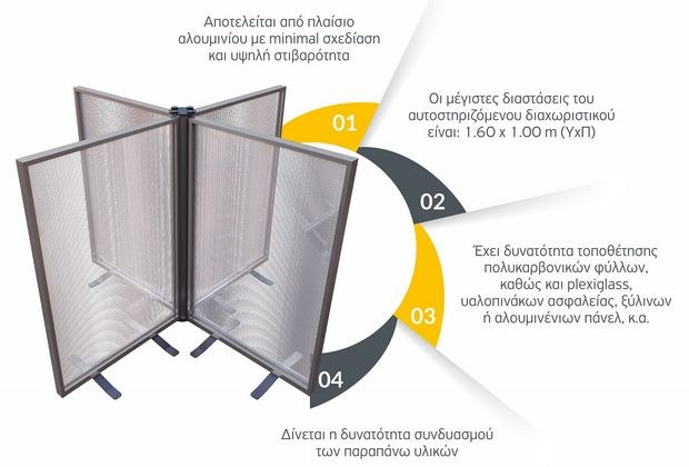 Αποτελείται από πλαίσιο αλουμινίου και μπορεί να δεχτεί ένα σύνολο διάφανων ή μη διαχωριστικών πάνελ. Είναι ιδανικό για χώρους εστίασης και αναψυχής (εστιατόρια, καφετέριες, μπαρ κ.λπ.), χώρους προσωπικής φροντίδας (κομμωτήρια), εργασιακούς χώρους, εμπορικά καταστήματα, δημόσιες υπηρεσίες και οργανισμούς και οποιονδήποτε άλλο χώρο φιλοξενεί πελάτες.