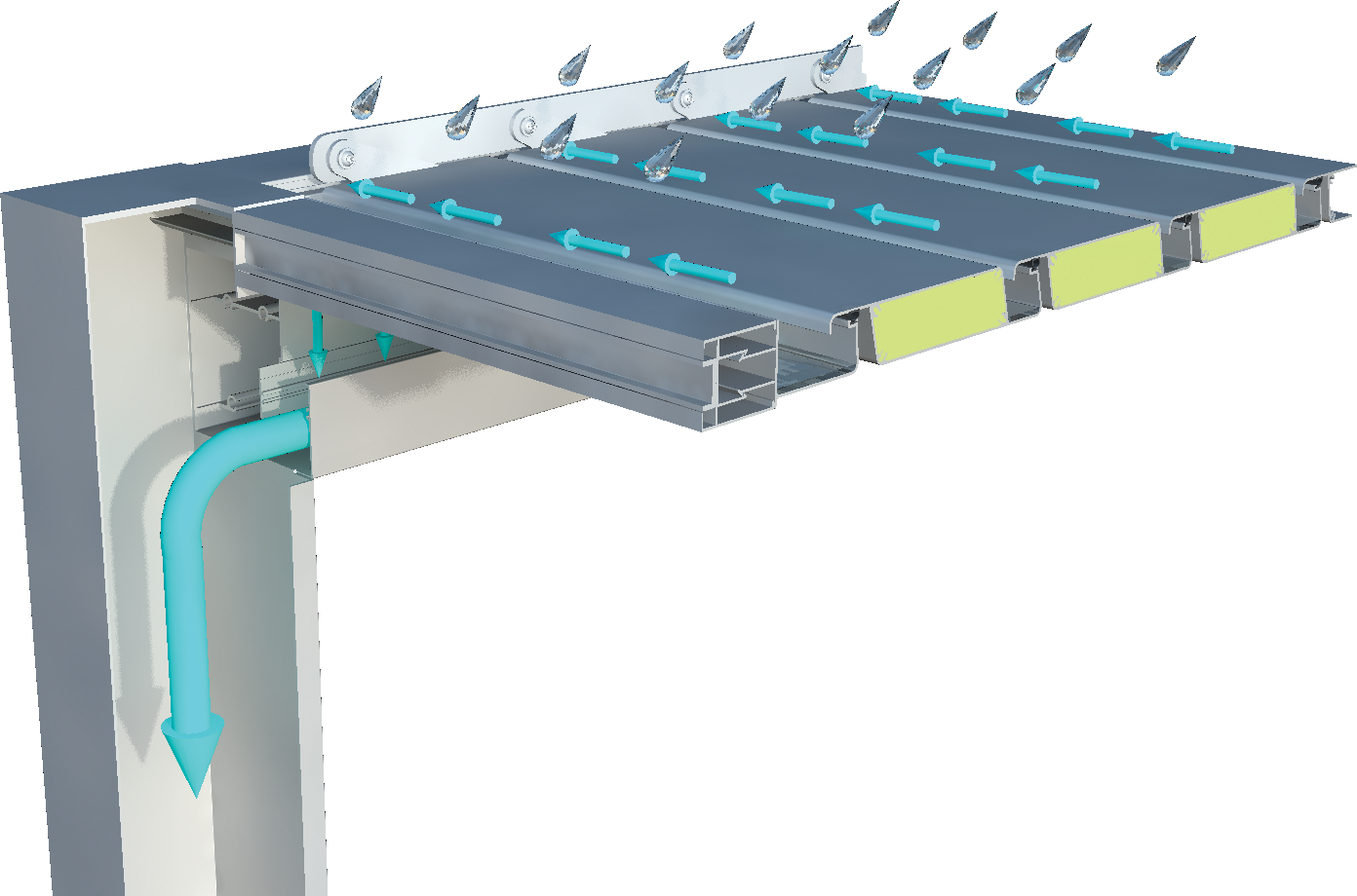 Ο έξυπνος σχεδιασμός της βιοκλιματικής πέργκολας, αποτρέπει την εισροή νερού στον χώρο που καλύπτει, οδηγώντας το μέσα στην κολώνα.
